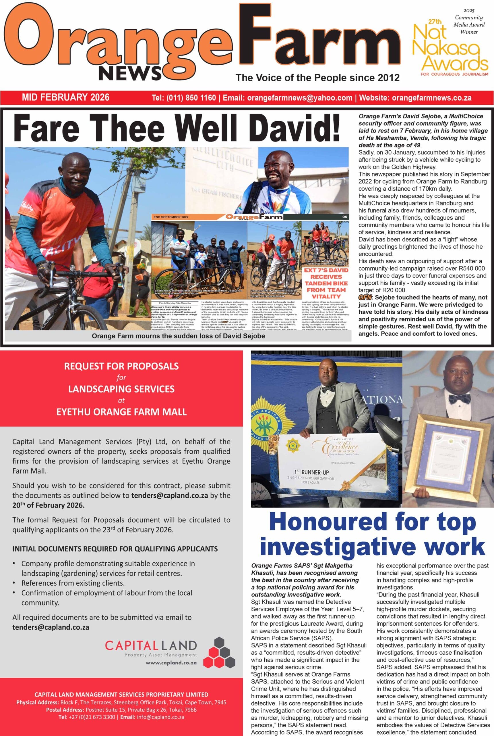 This edition features a farewell to David Sejobe, honours Sgt Khasuli for investigative excellence, highlights local artists, service delivery updates, matric achievements, and community organisations calling for support.